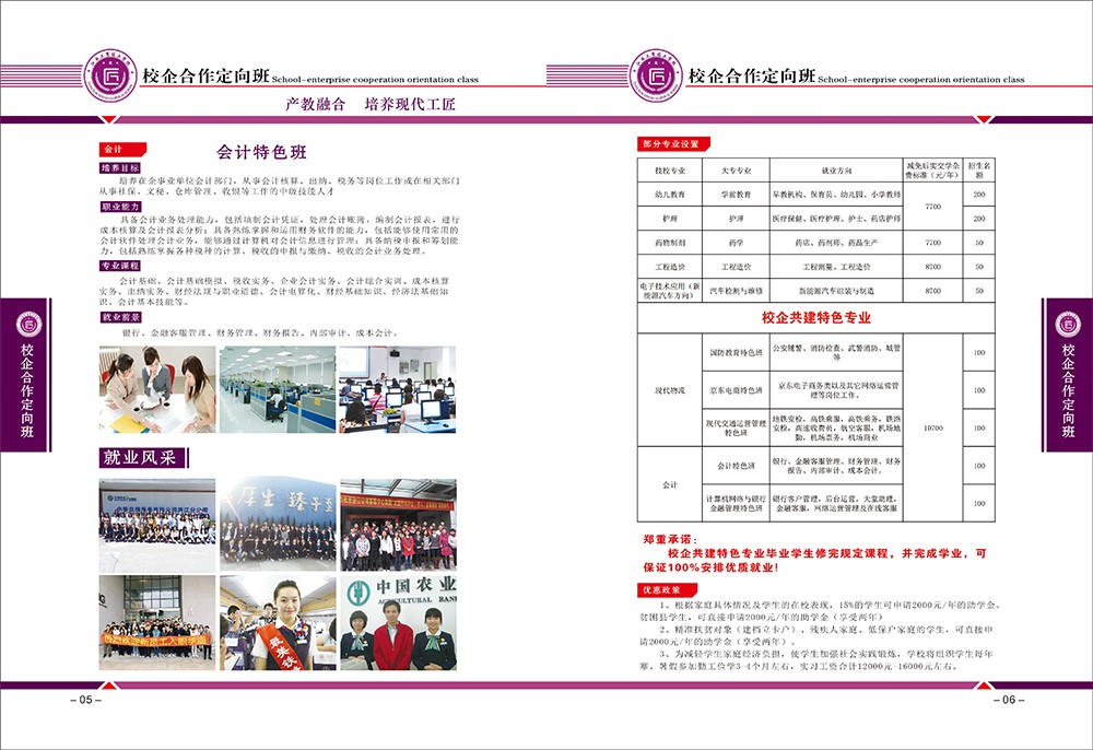 學校依托行業(yè)和支柱產業(yè),積極探索和完善工學結合、校企合作的“訂單式”人才培養(yǎng)模式,與省內外幾十家大型企業(yè)集團外資合資企業(yè)建立長期穩(wěn)定的就業(yè)推薦網絡,與眾多用人單位建立長期“訂單式”教育及用人合作關系,保障就業(yè)安置到位,解決學生就業(yè)的后顧之憂,歷年畢業(yè)生就業(yè)率居全省同類院校前列。